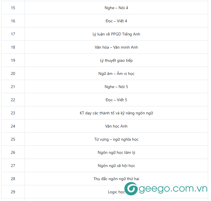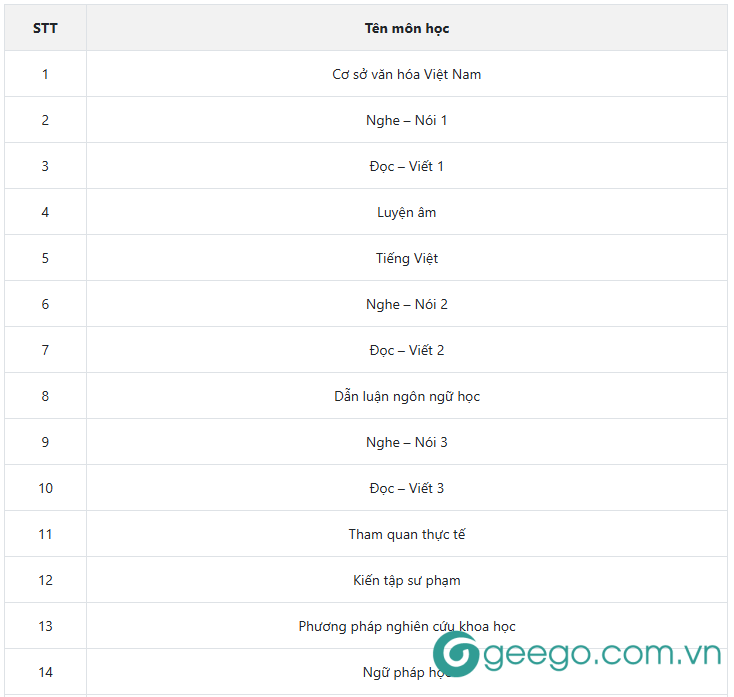 Với khối lượng kiến thức này sẽ đi sâu vào từng khía cạnh của ngôn ngữ cũng như phương pháp giảng dạy. Sinh viên sẽ được học những môn học cơ bản về ngôn ngữ học, văn hóa, nhất là kỹ thuật giảng dạy.